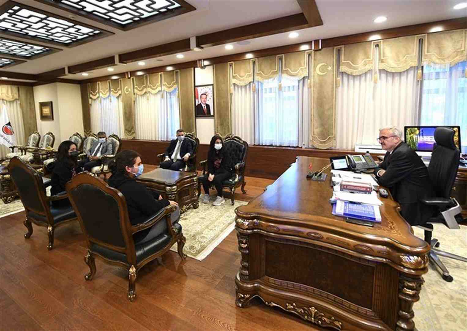 Öğrencilerle makamında bir süre sohbet eden Karaloğlu, üç öğrenciyi başarılarından dolayı tebrik etti.