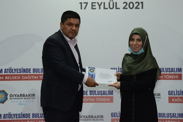 Diyarbakır Büyükşehir Belediyesi’nin “Gelişim Atölyesinde Buluşalım” eğitim programlarına katılan 90 kursiyer katılım belgelerini aldı.