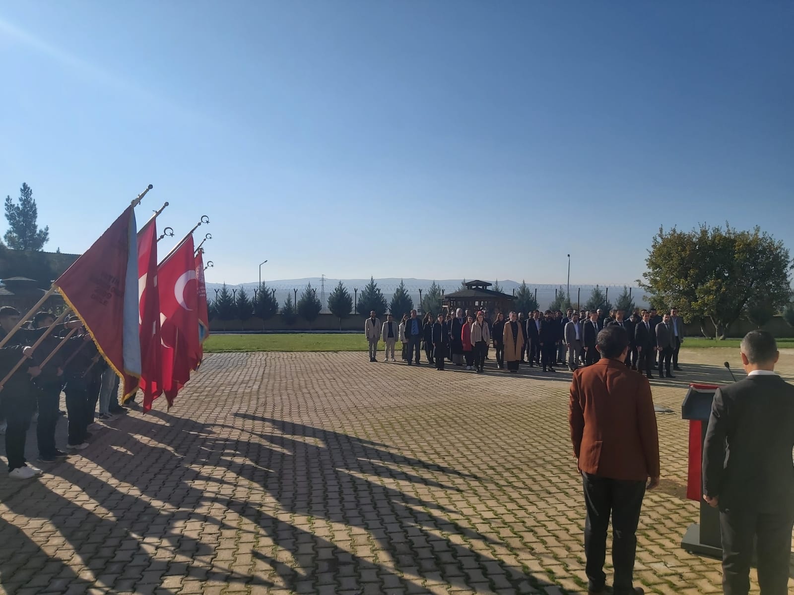 Necati Ceylan Anadolu Lisesi İngilizce Öğretmeni Devrim Resul Özdilek’in sunduğu çelenk sunma töreni, saygı duruşu ve İstiklal Marşı’nın okunmasıyla suna erdi.