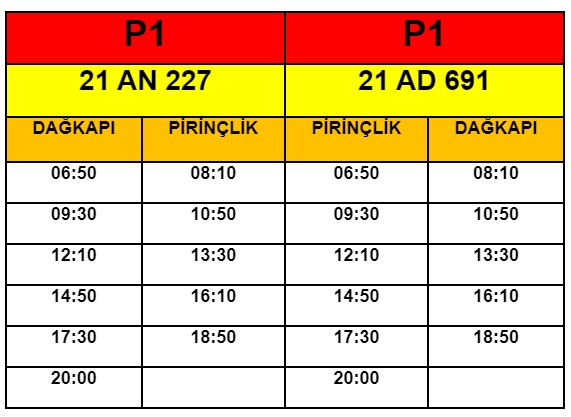 Pirinçlik – Otogar durakları arası hizmet veren “P1” otobüs hattı güzergâhı ise Dağkapı’ya kadar uzatılarak tek olan otobüs sayısı 2’ye çıkarıldı.